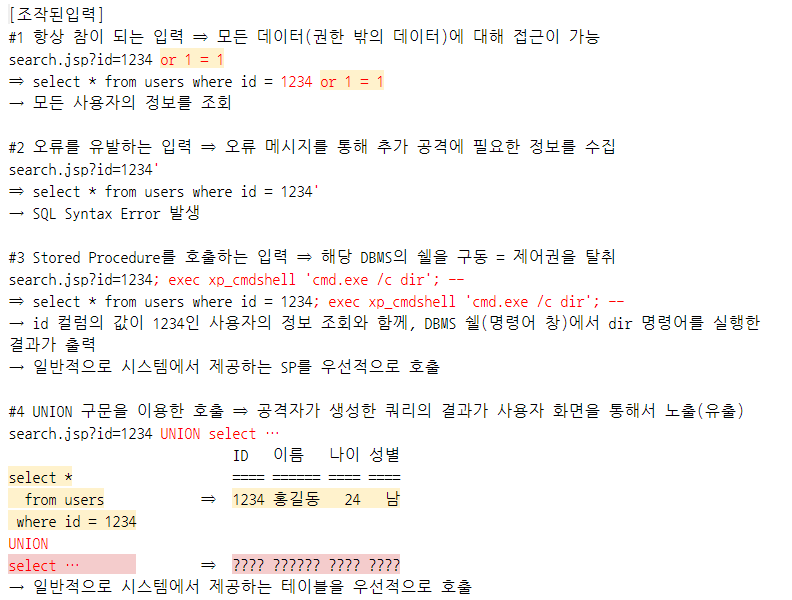 외부 입력값에 쿼리 조작 문자열 포함 여부를 확인하지 않고 쿼리문(SQL) 생성 및 실행에 사용하는 경우 발생
